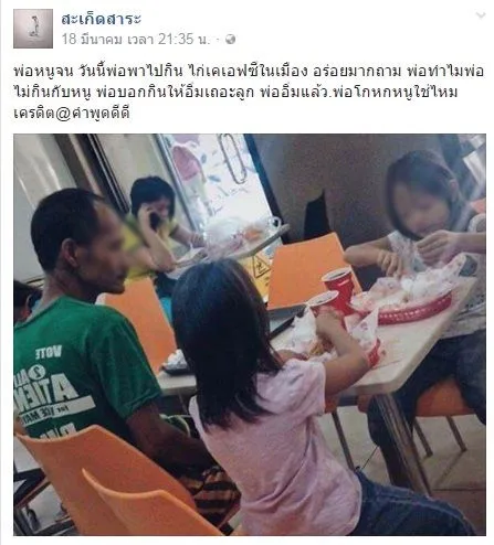 พ่อหนูจน วันนี้พ่อพาไปกิน ไก่เคเอฟซีในเมือง อร่อยมากถาม พ่อทำไมพ่อไม่กินกับหนู พ่อบอกกินให้อิ่มเถอะลูก พ่ออิ่มแล้ว.พ่อโกหกหนูใช่ไหม