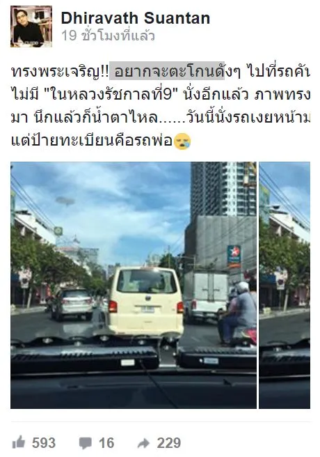 เป็นอีกหนึ่งเรื่องราวถูกแชร์และกล่าวถึงในโลกออนไลน์จำนวนมาก เมื่อผู้ใช้เฟซบุ๊ก Dhiravath Suantan ผู้สื่อข่าวช่อง 3 ได้โพสต์รูปภาพพร้อมข้อความระบุว่า…ทรงพระเจริญ!! อยากจะตะโกนดังๆ ไปที่รถคันข้างหน้า แต่เป็นรถเปล่าที่ไม่มี “ในหลวงรัชกาลที่9” นั่งอีกแล้ว ภาพทรงโบกพระหัตถ์ชินตาหวนกลับมา นึกแล้วก็น้ำตาไหล……วันนี้นั่งรถเงยหน้ามานึกว่ารถวังแซงไปธรรมดา แต่ป้ายทะเบียนคือรถพ่อ
