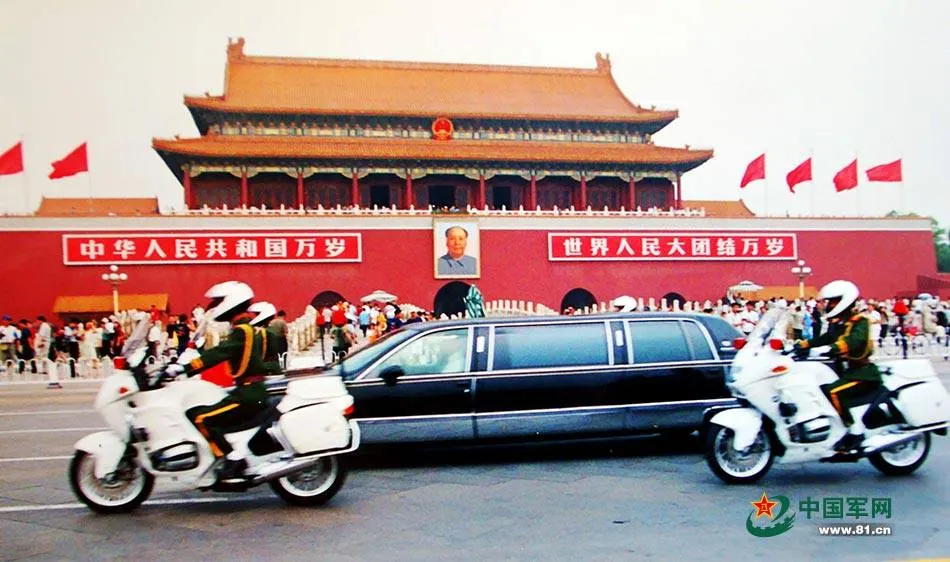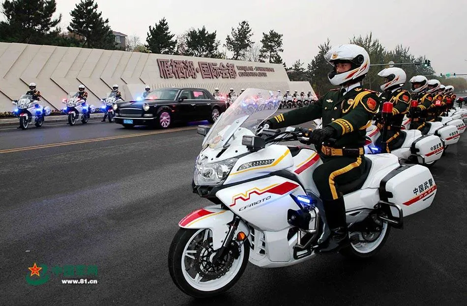 หลังจากที่จีนเริ่มสร้างกองเกียรติยศแห่งกองทัพปลดปล่อยประชาชนทั้งสามเหล่าเมื่อเดือนมิถุนายน ปี 1954 จีนก็เริ่มก่อตั้งกองทหารจักรยานยนต์คุ้มกันที่มีหน้าที่คุ้มกันแขกระดับประเทศจากนานาประเทศ โดยแขกคนแรกที่กองทหารหน่วยนี้ได้อารักขาก็คือ