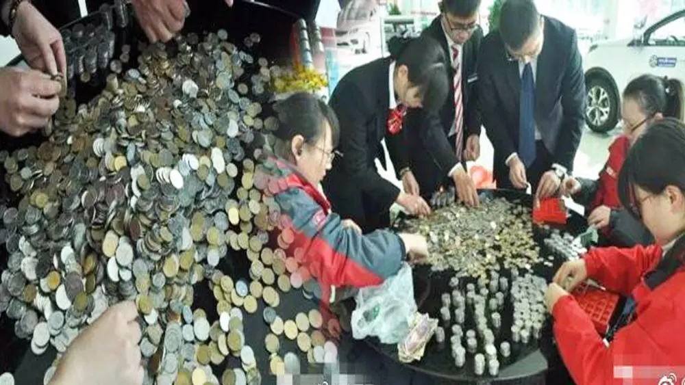 ชาวสวนในเมืองเหยียนเฉิง มณฑลเจียงซูทางตะวันออกเฉียงเหนือของจีน เอาถุงที่ใส่เหรียญจนเต็มมาซื้อรถที่ศูนย์บริการ ทำให้เจ้าหน้าที่ 8 คนของศูนย์ใช้เวลา 4 ชั่วโมงเพื่อนับเหรียญได้ทั้งหมด 49,670 หยวน (ราว 273,000 บาท) ซึ่งหลังจากเขาเอาเหรียญเหล่านี้มาเป็นเงินดาว์นแล้วก็ขับรถที่ซื้อกลับบ้านอย่างสบายใจ