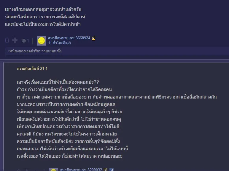สมาชิกเวบไซต์พันทิปโพสท์ถึงรายการ the mask Singer โดยระบุว่า ผิดหวังกับเทปสดวันนี้มาก แล้วเอาจริงๆ ปกติผมดูจบกะว่าจะนั่งเขียนงานต่อ แต่คุณบอกว่าจะเปิดหน้ากากเลยรอดูตั้งนาน สรุป โทรลกันดื้อๆ แบบนี้เลยหรือครับ