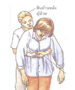 โดยใช้วิธียืนอยู่ข้างหลัง ใช้มือกอดรัดให้แน่นบริเวณใต้หน้าอกเหนือกระบังลม จากนั้นก็กระแทกมือซ้ำๆ เพื่อทำให้อาหารที่ิดอยู่ในหลอลมหลุดออกมา