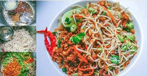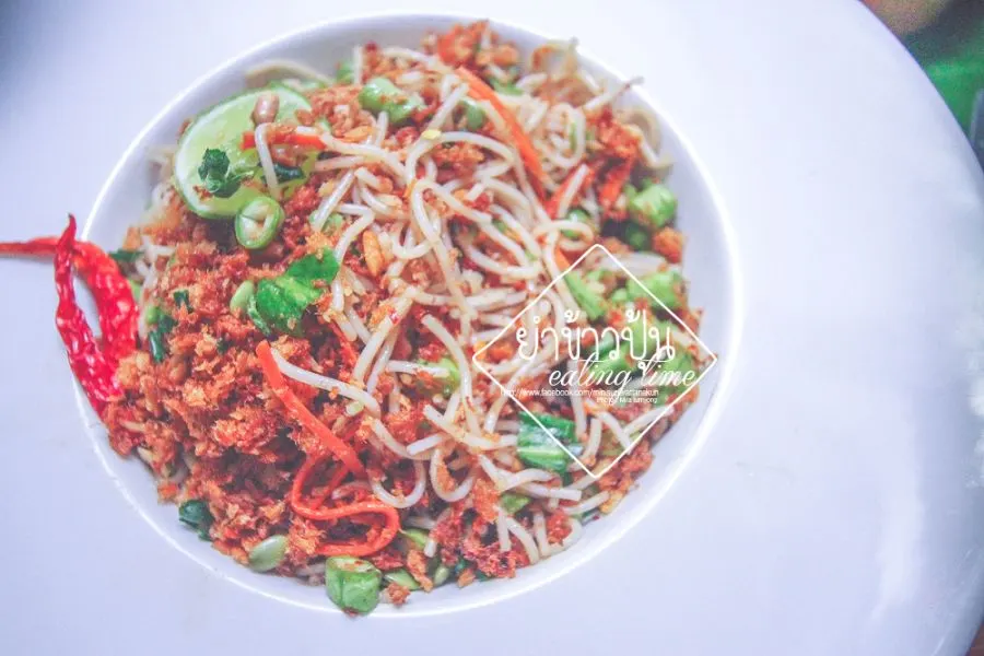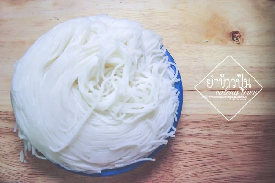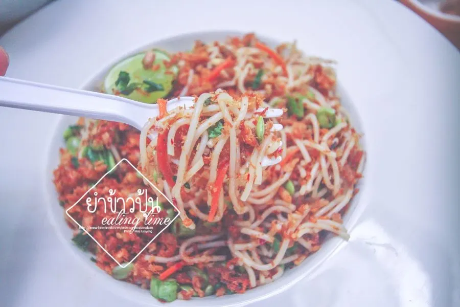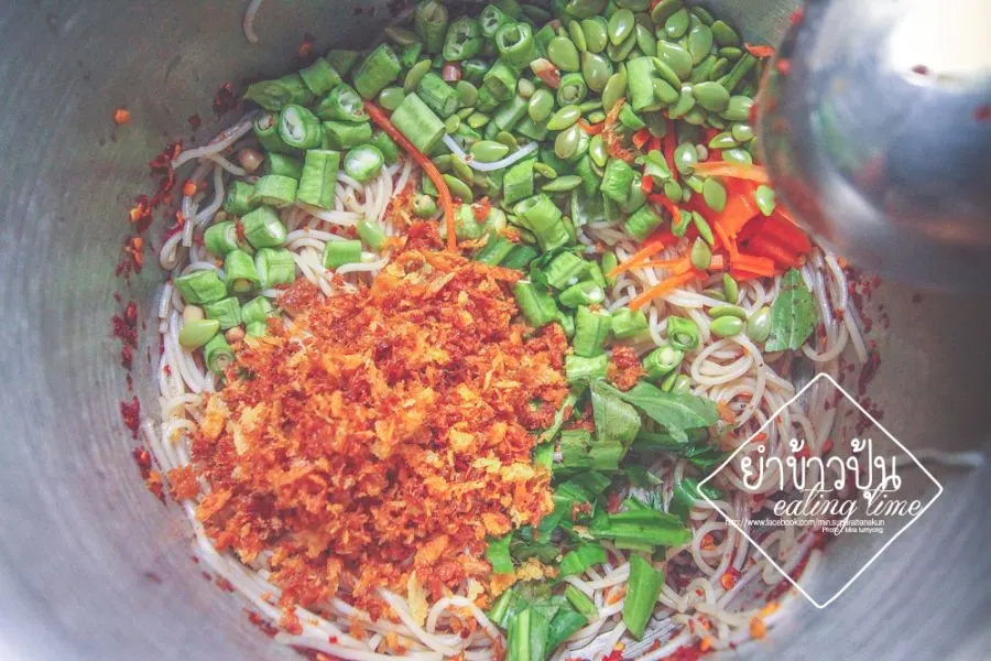 ชิมได้รสที่ใช่แล้วก็ใส่ข้าวปุ้นหรือขนมจีนตามลงไป คลุกเคล้าส่วนผสมให้เข้ากัน
