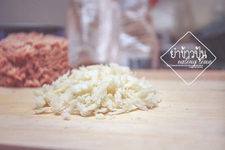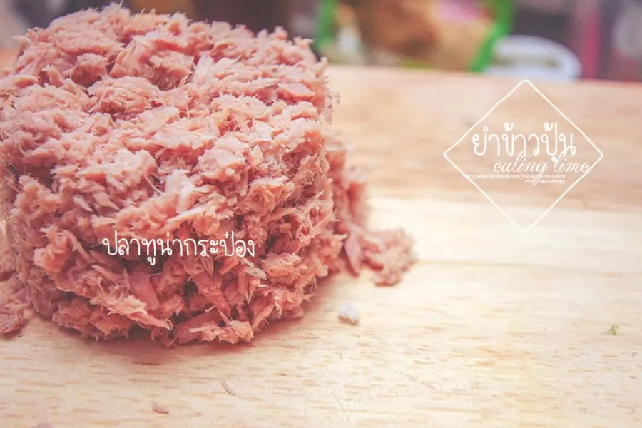ปลาทูน่ากระป๋อง มาซับน้ำให้หมาดๆแล้วใช้ซ่อมยีๆให้เนื่อปลาไม่เป็นก้อน