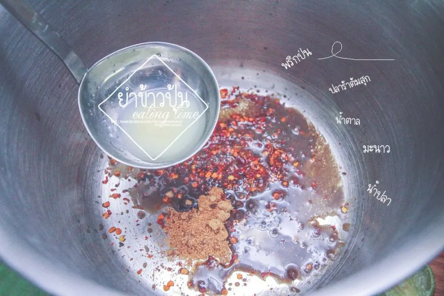 เสร็จจากขั้นตอนการทอดแล้วเรามาทำน้ำยำต่อเลย ใส่พริกป่น น้ำตาล น้ำมะนาว น้ำปลา และน้ำปลาร้าชิมรสที่ชอบจะใส่พริกสดหั่นแทนพริกป่นก็ได้นะคะแล้วแต่ชอบเลย