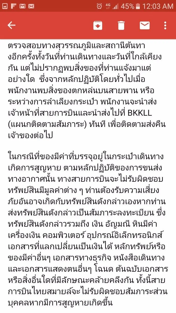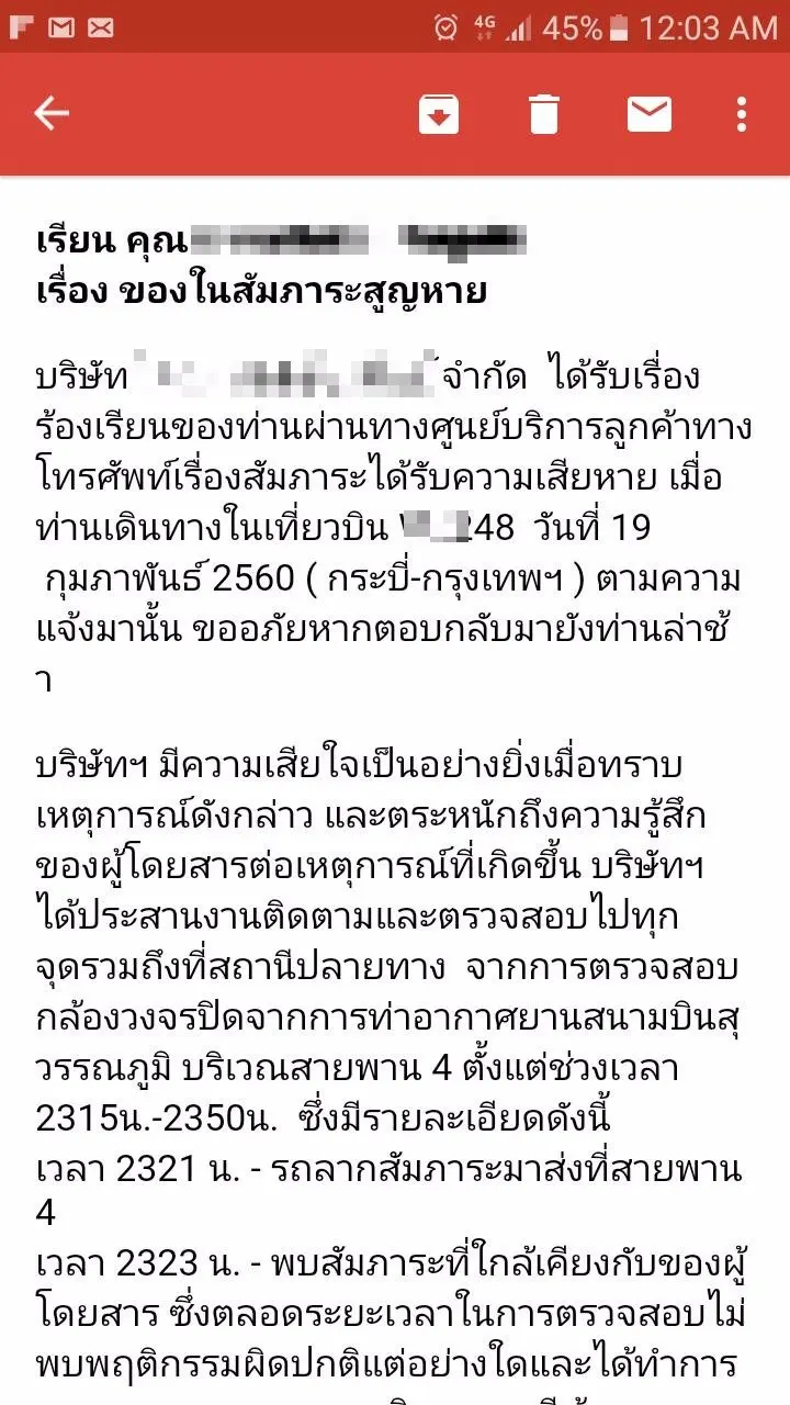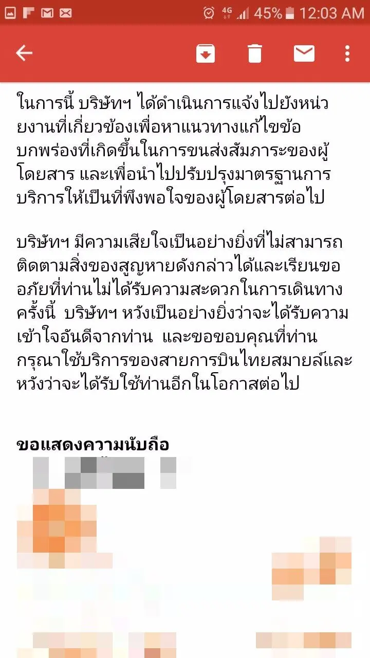 พอเราโทรไปหา call center เล่ารายละเอียดให้ฟังว่าโดนรื้อกระเป๋ายังไง ทาง call center ก็บอกให้เราส่ง email มาซึ่งเวลานั้นก็ประมาณห้าทุ่มกว่าๆ เราก็เกรงใจเพื่อนเพราะดึกมากแล้วและพรุ่งนี้ต้องทำงานกัน เราจึงกะว่าวันรุ่งขึ้นก็ค่อย mail หาทาง Thai Smile อีกที