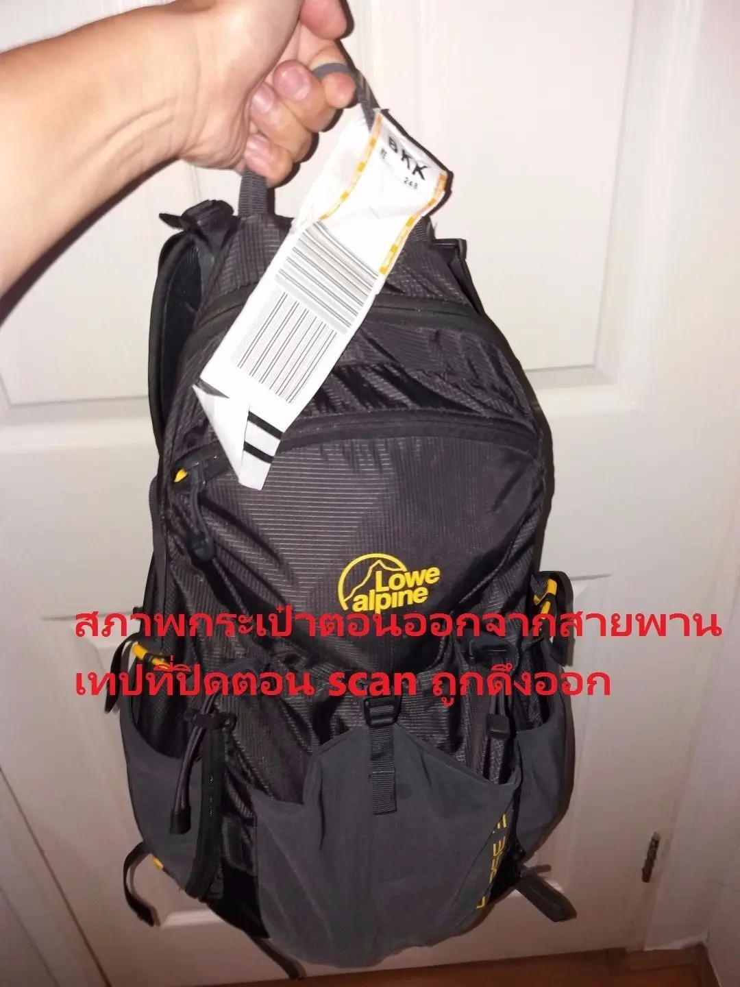 พอมาถึงสุวรรณภูมิเวลาประมาณสี่ทุ่มครึ่งก็มารอกระเป๋าที่ load ไว้ที่สายพาน เมื่อได้กระเป๋าก็รู้สึกแปลกใจว่ากระเป๋าเราไม่มีแถบสติ๊กเกอร์ที่เวลาตอน scan กระเป๋าเสร็จจะทีเจ้าหน้าที่ติดสติ้กเกอร์นี้ให้ โดยสภาพกระเป๋าก็ประมาณนี้ครับ