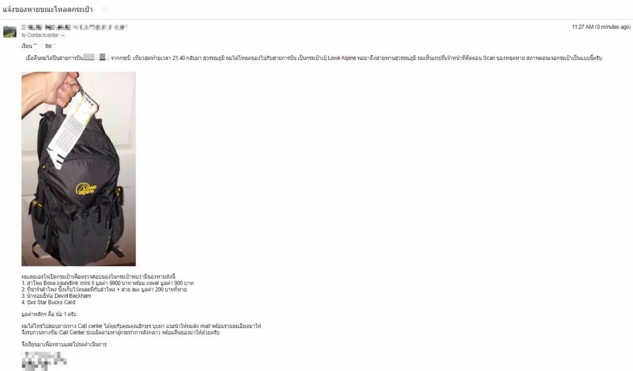 พอดีเดินทางไปกับเพื่อนประมาณ 4-5 คน ก็แนะนำให้เราไปแจ้งที่ lost & found ของการบินxxx พอไปถึงก็เจอเจ้าหน้าที่เหลือคนเดียวซึ่งกำลังจะปิด office เนื่องจากจะรีบไปไหนซักที่และให้เราโทรไปที่ call center ของ xxx แล้วก็ปิด office เดินจากไปเหลือไว้แค่ป้ายหน้า office