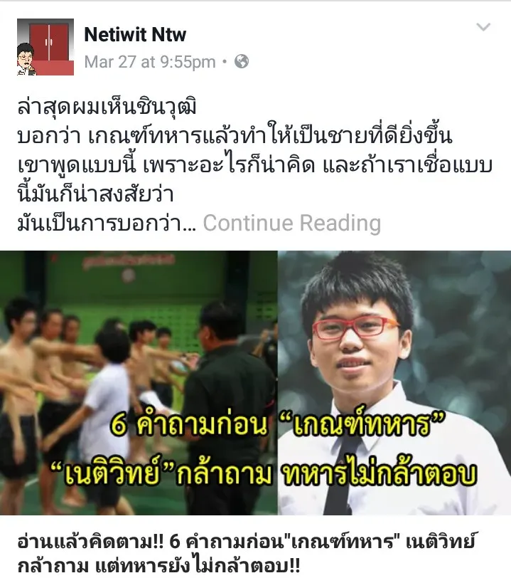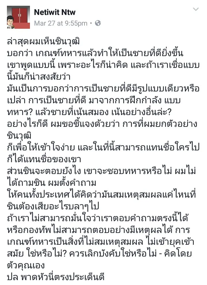 “ล่าสุดผมเห็นชินวุฒิ บอกว่า เกณฑ์ทหารแล้วทำให้เป็นชายที่ดียิ่งขึ้นเขาพูดแบบนี้ เพราะอะไรก็น่าคิด และถ้าเราเชื่อแบบนี้มันก็น่าสงสัยว่ามันเป็นการบอกว่าการเป็นชายที่ดีมีรูปแบบเดียวหรือเปล่า การเป็นชายที่ดี มาจากการฝึกกำลัง แบบทหาร? แล้วชายที่เน้นสมอง เน้นอย่างอื่นล่ะ? อย่างไรก็ดี ผมขอชี้แจงด้วยว่า การที่ผมยกตัวอย่างชินวุฒิ ก็เพื่อให้เข้าใจง่าย และในที่นี้สามารถแทนชื่อใครไปก็ได้แทนชื่อของเขา