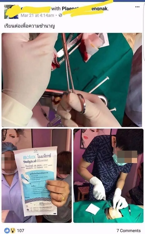 โดยภาพต่างๆ เหล่านี้ น่าตกใจมาก ไม่น่าเชื่อว่าจะมีแบบนี้ในวงการศัลยกรรม ซึ่งพบว่ามีการนำเอาผู้ชายวัยรุ่นคนหนึ่งมาเป็นหมอเถื่อนเรียกกันว่า “หมอต้อล” หรือ ดนัย ทำศัลยกรรมเสริมจมูก ทำปากกระจับให้คนไข้หลายราย พร้อมกับโชว์ภาพคนไข้หลังจากทำเสร็จอีกด้วย ซึ่งพบว่ามีหมอจริงร่วมขบวนการด้วย เป็นคลินิกแห่งหนึ่งย่านนอร์ทปาร์ค