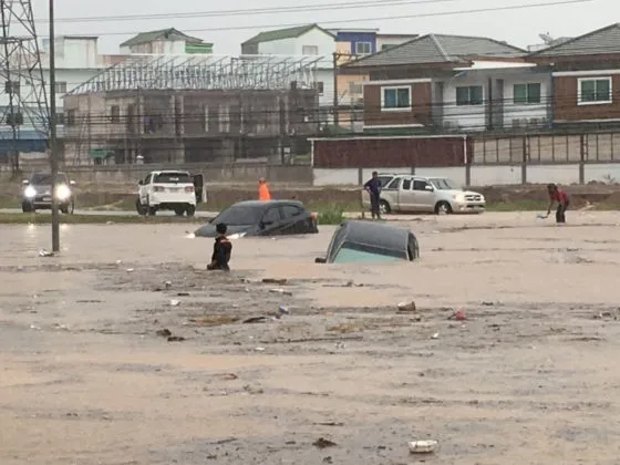 ฝนตกหนัก ระยอง น้ำท่วมสูงมาก จนคนต้องปีนหนีออกจากรถ เพื่อความปลอดภัย