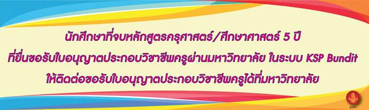 คุรุสภาแจ้งมา - ระบบ KSP Bundit กำหนดให้มหาวิทยาลัยดำเนินการยื่นขอใบอนุญาตประกอบวิชาชีพครูให้นักนักศึกษาทั้งหลักสูตรมายังคุรุสภา เพื่อเป็นระบบและอำนวยความสะดวกแก่นักศึกษา เมื่อคุรุสภาดำเนินการอนุมัติใบอนุญาตประกอบวิชาชีพครูเรียบร้อยแล้ว จะส่งใบอนุญาตไปยังมหาวิทยาลัยแห่งนั้น เพื่อแจกจ่ายให้นักศึกษา