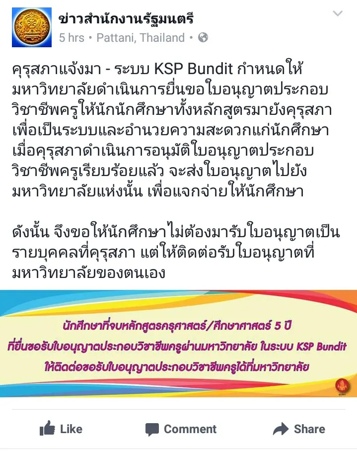 ดังนั้น จึงขอให้นักศึกษาไม่ต้องมารับใบอนุญาตเป็นรายบุคคลที่คุรุสภา แต่ให้ติดต่อรับใบอนุญาตที่มหาวิทยาลัยของตนเอง