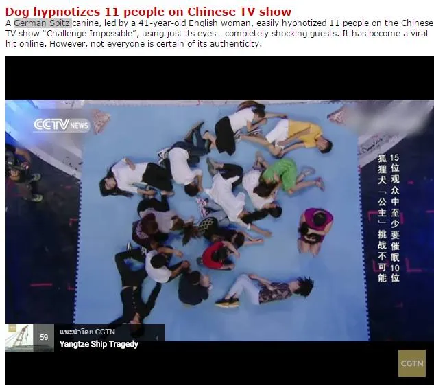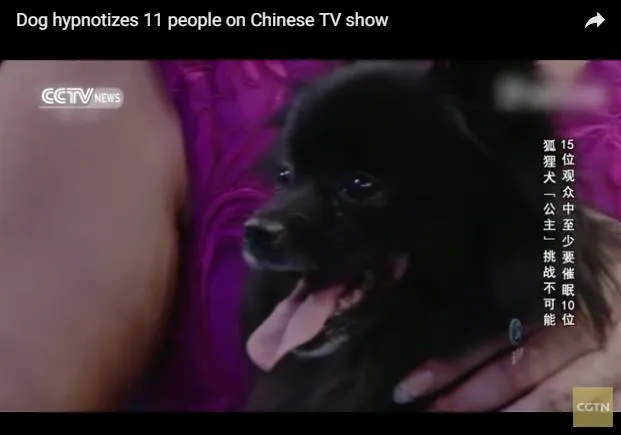 สุนัขตัวนี้ พันธ์ German Spitz สีดำ ได้ถูกนำมาออกรายการ ทีวี Challenge Impossible ใน ประเทศจีน ซึ่งเป็นรายการเกี่ยวกับ โชว์ความสามารถพิเศษ พรสวรรค์ต่างๆ โดยคนบนเวที เป็นคนมาจากทางบ้าน อาสา มา 11 คน เพื่อท้าพิสูจน์ ว่า สุนัขตัวนี้ สะกดจิตได้จริงเปล่า