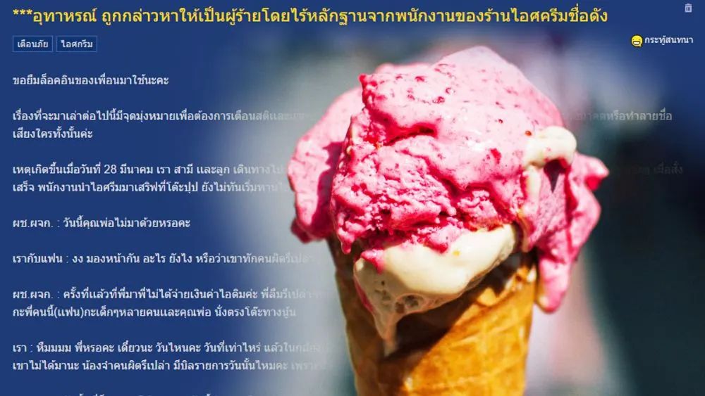 สมาชิกเวบไซต์พันทิป แชร์เรื่องราวให้เป็นอุทาหรณ์ เตือนสติ เมื่อไปทานไอติดชื่อดัง อยู่ๆก็โดนกล่าวหาว่าเป็นผู้ร้าย ไม่จ่ายเงินค่าไอติมครั้งก่อน โดยไร้หลักฐาน โดยเธอเล่าไว้ว่า....