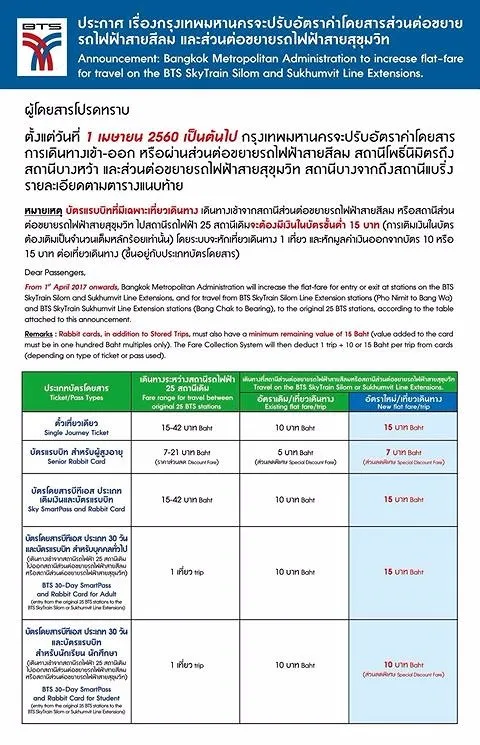 ตั้งแต่วันที่ 1 เมษายน 2560 เป็นต้นไป กรุงเทพมหานครแจ้งปรับอัตรา