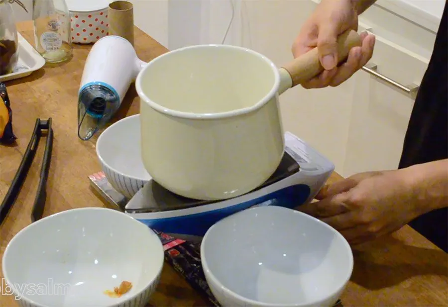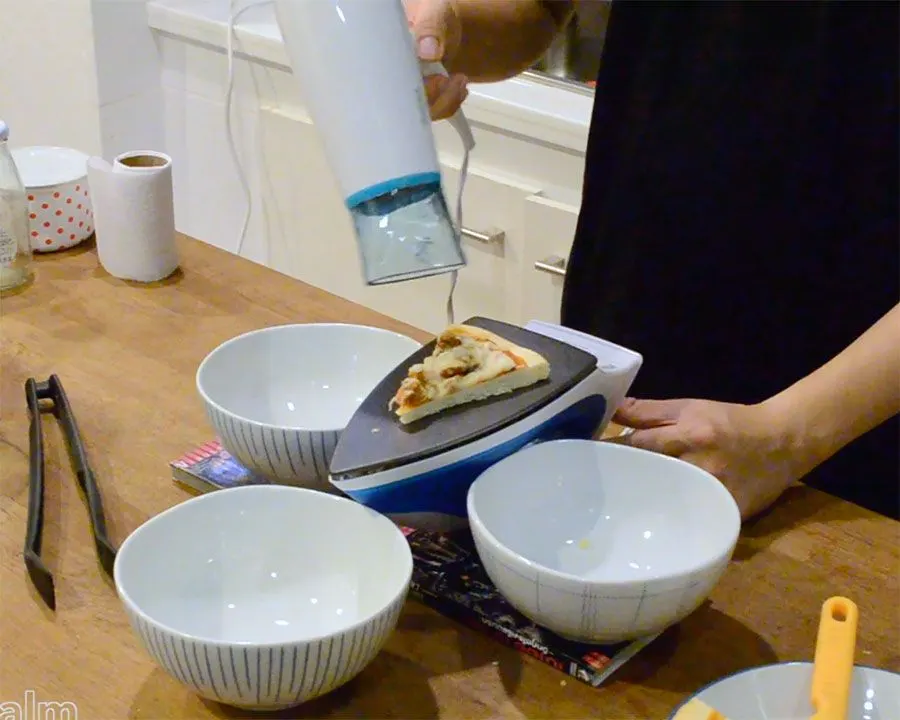 รอจนเตารีดร้อน หั่นพิซซาขนาดพอดีคำ แล้ววางลงไป ซู่! จากนั้นเอาไดร์เป่า