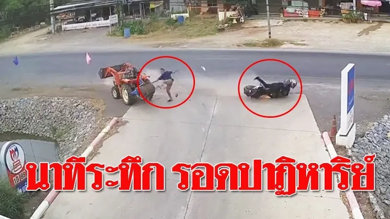 โดยเหตุการณ์นี้เป็นช่วงเวลาที่ชายคนหนึ่งเดินอยู่หน้าปั้มมน้ำมัน ปรากฏว่ามีรถจักรยายนต์คันหนึ่งขับมาด้วยความเร็ว เกิดเสียหลักพลิกคว่ำทั้งคนทั้งรถไถลพุ่งไปหาชายคนดังกล่าว เฉี่ยวชนจนรองเท้ากระเด็น ก่อนที่ทั้งคนทั้งรถจักรยานยนต์จะพุ่งลงไปที่หนองน้ำหน้าปั๊ม โดยเบื้องต้นทราบว่าคนขี่รถจักรยานยนต์ได้รับบาดเจ็บ ชาวบ้านช่วยกันนำส่งโรงพยาบาลรักษาตัวแล้ว
