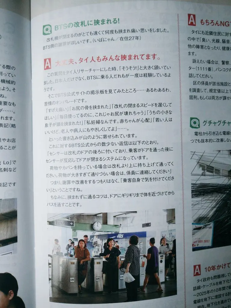 ชาวพันทิปโพสท์ว่า คนญี่ปุ่นอยู่ไทยมา 27 ปี บอกว่าเครื่องตรวจตั๋ว BTS ปิดเร็วมาก กี่ครั้งก็โดนหนีบ อยากได้คำขอโทษจาก BTS คำตอบคือ ไม่เป็นไร คนไทยก็โดนทุกคน 555(เป็น free paper ชื่อ DACO ค่ะ เวอร์ชั่นภาษาญี่ปุ่น ฉบับวันที่ 20 เดือน 3 ค่ะ)