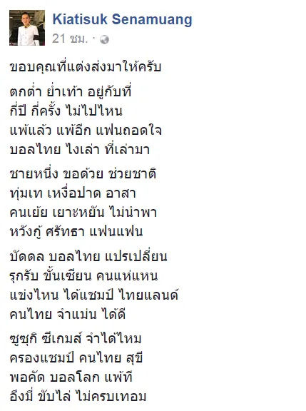 โดนใจ!! โค้ชซิโก้ โพสกลอนลงเฟสบุค.. พาทีมไทยคว้าแชมป์คนชม พอแพ้บอลโลกโดนรุมเหยียบ