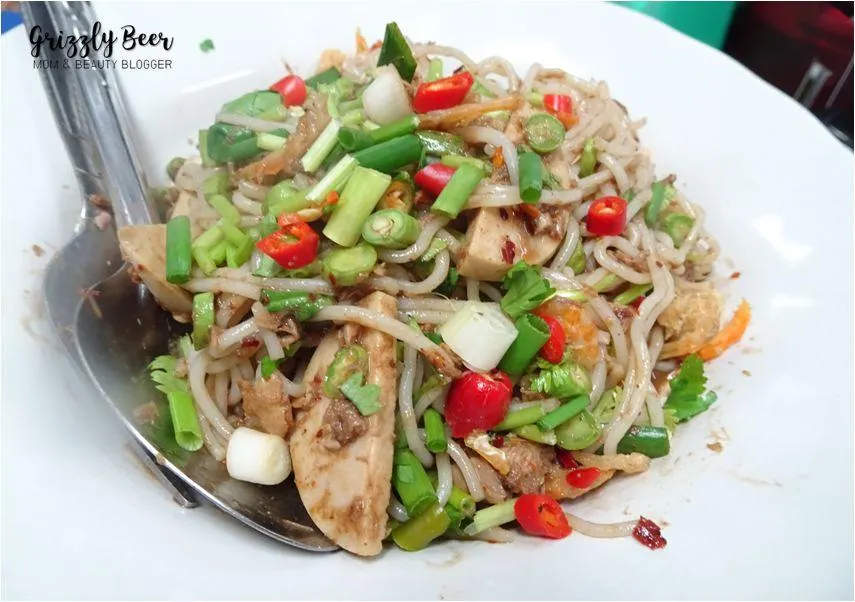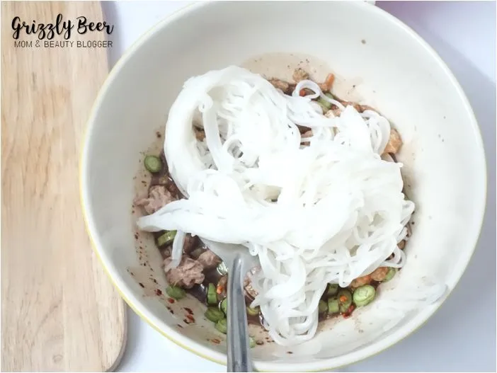 - ฉีกขนมจีนใส่ลงไป คลุกอีกครั้ง