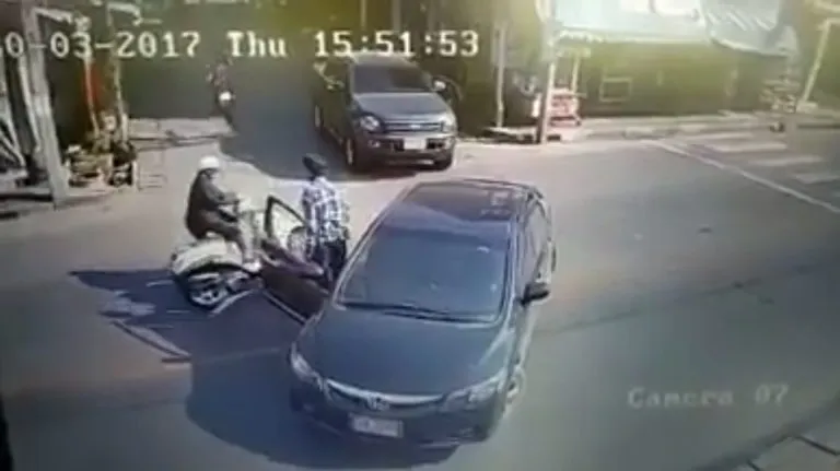 "เก๋งลงจากรถ" ผลักหัวคนขี่รถจักยานยนต์จนล้ม