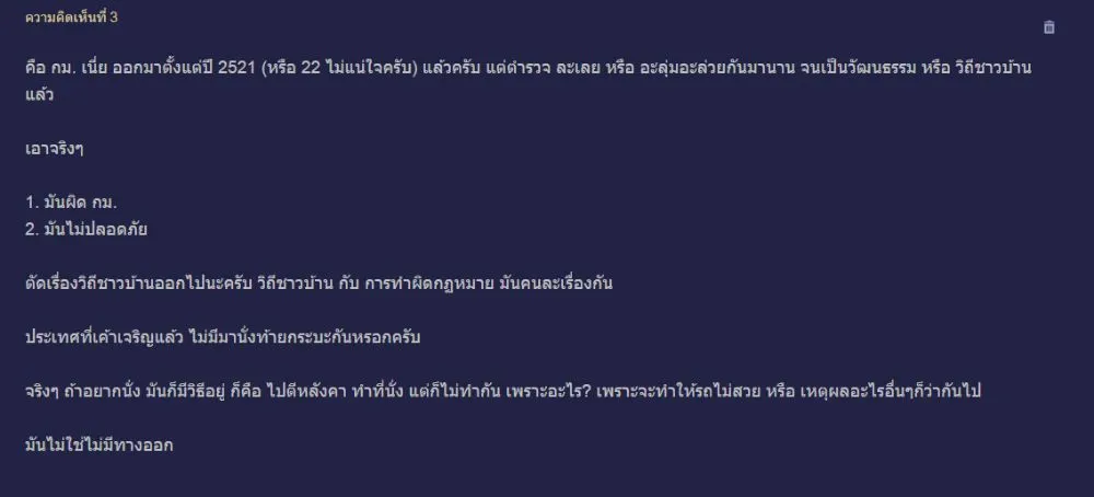 กฎหมายนะดี แต่การออกกฎหมาย น่าจะศึกษาให้ครอบคลุมว่า ออกมาแล้วผลกระทบเป็นวงกว้างแค่ไหน และที่สำคัญ การเกิดอุบัติเหตุส่วนใหญ่ มัน