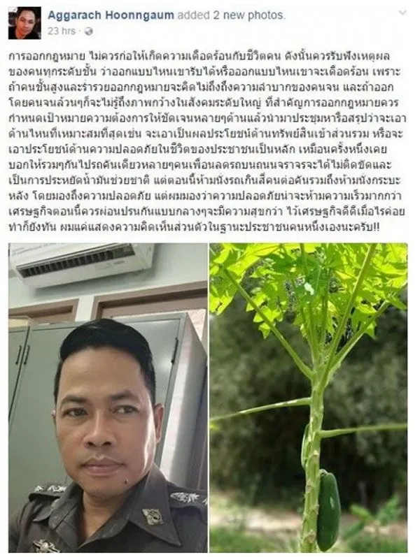 ด้าน พ.ต.ท.เอกราช หุ่นงาม สว.อก.สภ.สลุย อ.ท่าแซะ จ.ชุมพร ได้โพสต์ข้อความผ่านเฟซบุ๊กส่วนตัวแสดงความเห็นเกี่ยวกับการบังคับใช้กฎหมายดังกล่าว โดยระบุว่า “การออกกฎหมายไม่ควรก่อให้เกิดความเดือดร้อนกับชีวิตคน ดังนั้นควรรับฟังเหตุผลของคนทุกระดับชั้นว่าออกแบบไหนเขารับได้ หรือออกแบบไหนเขาจะเดือดร้อน เพราะถ้าคนชั้นสูง และร่ำรวยออกกฎหมายจะคิดไม่ถึงถึงความลำบากของคนจน และถ้าออกโดยคนจนล้วน ๆ ก็จะไม่รู้ถึงภาพกว้างในสังคมระดับใหญ่ ที่สำคัญการออกกฎหมายควรกำหนดเป้าหมายความต้องการให้ชัดเจนหลาย ๆ ด้าน แล้วนำมาประชุมหารือสรุปว่าจะเอาด้านไหนที่เหมาะสมที่สุด เช่นจะเอาเป็นผลประโยชน์ด้านทรัพย์สินเข้าส่วนรวม หรือจะเอาประโยชน์ด้านความปลอดภัยในชีวิตของประชาชนเป็นหลัก เหมือนครั้งหนึ่งเคยบอกให้รวม ๆ กันไปรถคันเดียวหลาย ๆ คน เพื่อลดรถบนถนนจราจรจะได้ไม่ติดขัด และเป็นการประหยัดน้ำมันช่วยชาติแต่ตอนนี้ห้ามนั่งรถเกินสี่คนต่อคันรวมถึงห้ามนั่งกระบะหลัง โดยมองถึงความปลอดภัย แต่ผมมองว่าความปลอดภัยน่าจะห้ามความเร็วมากกว่าเศรษฐกิจตอนนี้ควรผ่อนปรนกันแบบกลาง ๆ จะมีความสุขกว่าไว้เศรษฐกิจดีดีเมื่อไรค่อยทำก็ยังทัน ผมแค่แสดงความคิดเห็นส่วนตัวในฐานะประชาชนคนหนึ่งเองนะครับ!!”นั้น