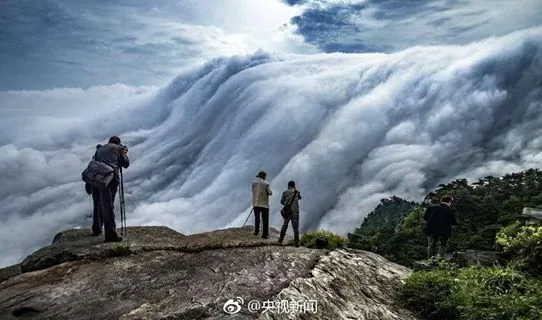 ชมภาพที่ถูกบันทึกไว้ในวันที่ 9 เมษายน 2017 เมื่อหมู่มวลก้อนเมฆและหมอกขนาดยักษ์ได้รวมตัวกันคล้ายคลื่นซัดเข้าใส่ยอดเขาหลูซาน ในมณฑลเจียงซีทางตะวันออกของประเทศจีน