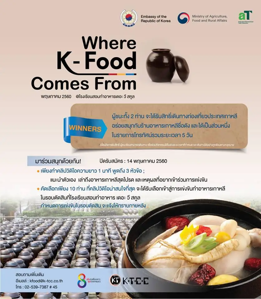 ขอเชิญเข้าร่วมแข่งขัน "Where K-Food Comes From" เพียงส่งคลิปวิดีโอ แนะนำตัวเอง อาหารเกาหลีที่ชื่นชอบ และเหตุผลที่อยากเข้าร่วมแข่งขันรายการนี้ ความยาว 1 นาที เพียง 10 ท่านที่ได้รับคัดเลีอก จะร่วมทำการแข่งขันทำอาหารเกาหลี ที่ เดอะ วี สคูล