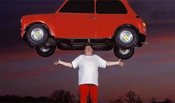 จอห์น อีแวนส์บาลานซ์รถมินิหนัก 352 ปอนด์ไว้บนหัวของเขาเป็นเวลา 33 วินาที