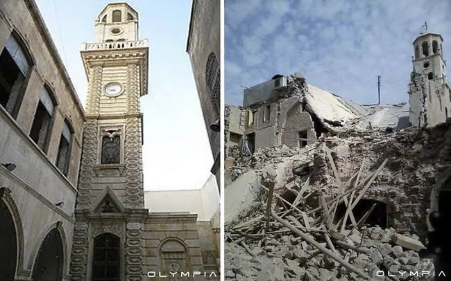 ทหารซีเรียได้ทิ้งระเบิดจำนวนมากจากเฮลิคอปเตอร์หลายลำ จนทำให้บ้านเมืองเสียหายวายวอด ผู้คนล้มตายจำนวนมาก ส่วนคนที่รอดชีวิตก็ต้องอพยพหนีออกไป สงครามได้ทำลายเมืองเก่าแก่ที่ถูกจัดให้เป็นมรดกโลกโดยยูเนสโก ดังที่เราจะได้เห็นจากภาพเปรียบเทียบดังต่อไปนี้