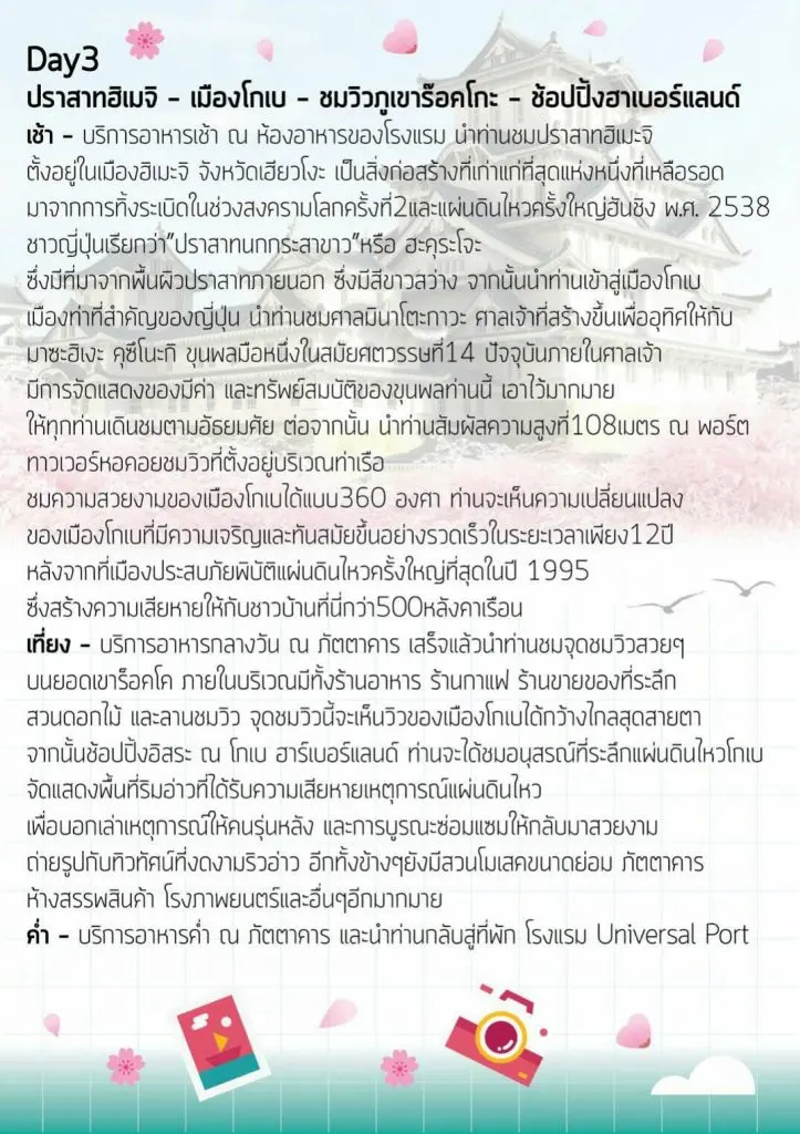 จากเหตุการณ์ เมื่อวันที่ 11 เมษายน ที่ผ่านมา กรณีนักท่องเที่ยวกว่า 1,000 คน ถูกลอยแพที่สนามบินสุวรรณภูมิ หลังหลงเชื่อยอมจ่าย 1 หมื่นบาท ทริปเที่ยวญี่ปุ่น 6 วัน อ้าง พักโรงแรมหรู 5 ดาว รับประทานอาหารภัตาคารหรูหลายแห่ง สถานที่ท่องเที่ยวมากมาย รวมถึงยูนิเวอร์แซล สตูดิโอ จนมีผู้ตกเป็นเหยื่อทั่วประเทศนับพันคน ล่าสุด สมาชิกเว็บพันทิป LiverLife ได้แชร์ตารางเที่ยวทริปนี้ ดังนี้