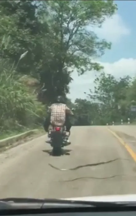 เป็นอีกหนึ่งคลิปที่คงไม่ได้เห็นกันบ่อยๆ เมื่อมีผู้ใช้เฟซบุ๊กรายหนึ่งซึ่งใช้ชื่อว่า Ruby Kidsshop ได้แชร์คลิปๆหนึ่งลงโลกโซเชียล พร้อมระบุข้อความในโพสต์ดังกล่าวว่า “เตือนภัยชาว Biker เจองูให้จอดหรือเข้าด้านหลังนะครับ งูโหดจริงๆ ^^”