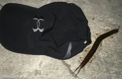 ต้องขออภัยที่ภาพไม่ชัด แต่ เจ้าพวกนี้เลื้อยได้เร็วมาก และ ผมมีแค่กล้องมือถือในมือ ถ้าเป็นกล้องถ่ายภาพแบบมืออาชีพ น่าจะได้ภาพที่ดีกว่านี้ ผมโยนหมวกลงไปเพื่อจะได้เห็นขนาดของเจ้าตัวนี้