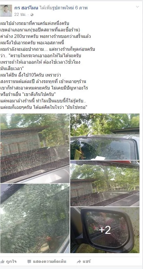 หนุ่มโพสต์ระบาย มันใช่หรือ!!?? เสียค่าล้างรถ 280 บาท แต่คราบออกไม่หมด