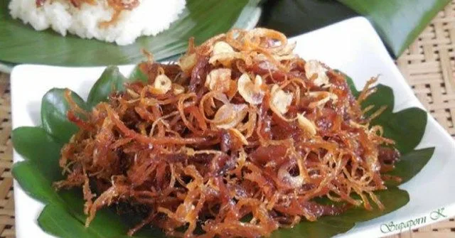 3.เทน้ำมันที่เจียวหอมออกครึ่งนึง ใส่น้ำตาล น้ำปลา ซีอิ้วดำ ดอกเกลือ พริกไทย ผัดให้หอมและส่วนผสมเข้ากันดี เติมน้ำลงไปประมาณสองถ้วย ใส่เนื้อที่ฉีกไว้ลงผัด ใช้ไฟกลางค่อนข้างอ่อน ประมาณ 30 นาที พอเนื้อที่ผัดแห้ง ใส่หอมเจียวลงไปครึ่งหนึ่ง (เก็บไว้โรยหน้าครึ่งหนึ่ง) คนให้เข้ากัน เป็นอันเสร็จ ทานคู่กับข้าวเหนียว อร่อยค่ะ