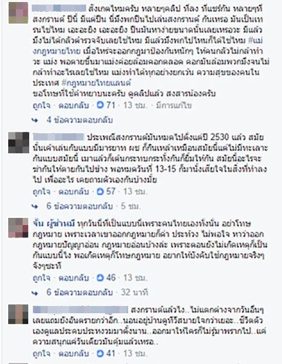 ต่อมาชาวเน็ตต่างแสดงความคิดเห็นต่างๆในเรื่องของ การใช้ปืนในช่วงเทศกาลต่างๆ และอีกหลายๆประเด็นซึ่งรวมไปถึงการเล่นสงกรานต์ที่มีแต่ความรุนแรงมากขึ้นๆในทุกปีๆที่ผ่านมา พร้อมทั้งถามหาความเข้มงวดของกฏหมายไทยในเรื่องของการพกพาอาวุธปืน