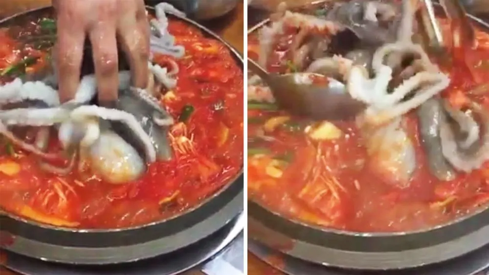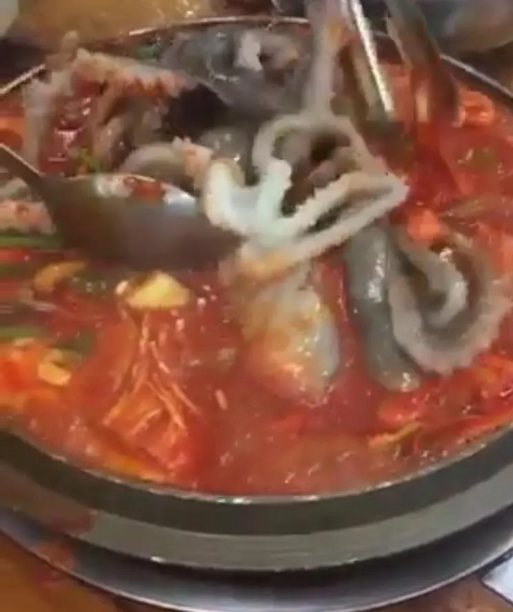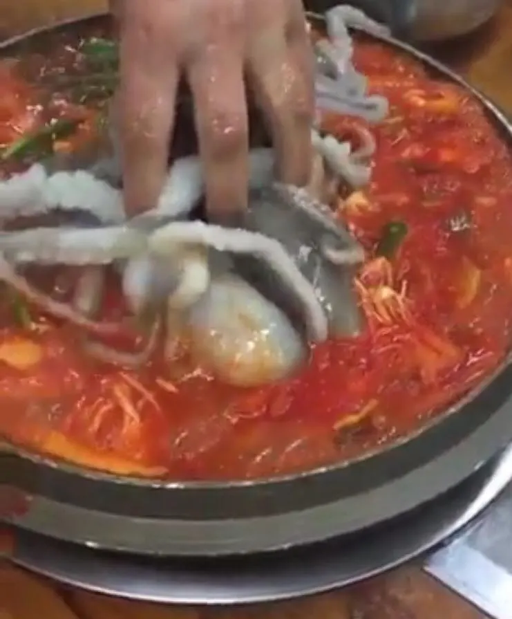 เมนูหมึกสดๆตัวเป็นๆ หย่อนลงในหม้อแกงที่กำลังเดือดปุดๆ นี่คือวิถีการกินอาหารแบบชาวเอเชียที่มักจะชอบทานอาหารแบบสดใหม่ มีความเชื่อว่าสามารถบำรุงร่างกายให้แข็งแรง ทั้งยังมีรสชาดที่อร่อย ส่วนบ้านเราก็มีกุ้งเต้นที่กินแบบตัวเป็นๆเช่นกัน ดูแล้วอาหารบางเมนูที่เราไม่คุ้นเคย ออกจะดูโหดไปหน่อย แต่วัฒนธรรมการกินของแต่ละประเทศก็มี ความเชื่อ ทัศนคติที่แตกต่างกันออกไปครับ