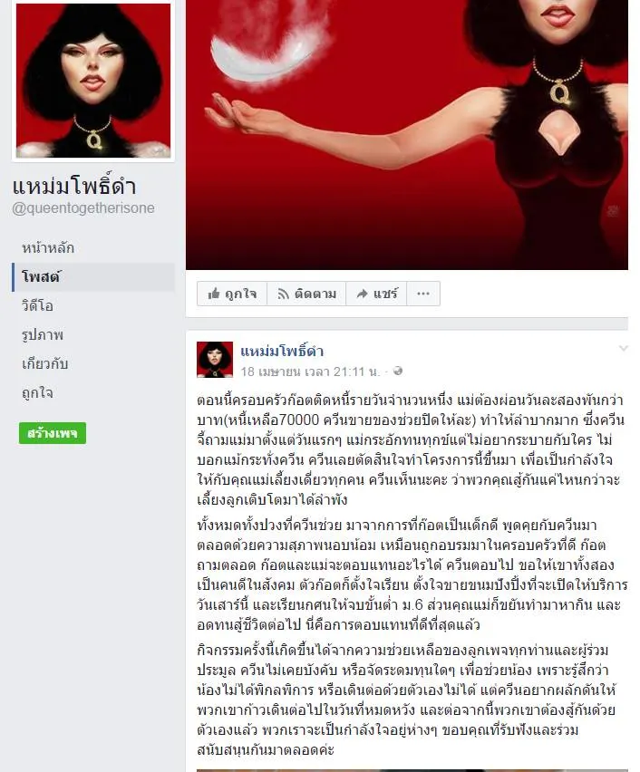 จากกรณี เฟซบุ้ค แหม่มโพธิ์ดำ ได้เคยนำเสนอ เรื่องราว น้องก็อต เด็กหนุ่มวัย 17 ปี ของลูกชาย บูบู้ สามีของตลกชื่อดัง ตุ้กกี้ ว่า ลูกชายไม่สามารถตbfต่อคนเป็นพ่อได้ จากที่เคยคุยกัน เฟสบุ้คก็โดนบล็อค ล่าสุด 18/4/2560 ทางเฟซบุ้ค แหม่มโพธิ์ดำ ได้โพสเรื่องราวของน้องก็อตอีกครั้ง ว่า ตอนนี้ ครอบครัวติดหนี้รายวันอยู่ ทางด้านน้องก็อตก็เรียน กศน. ควบคู่กับปิ้งขนมปังขายไปด้วย เพื่อแบ่งเบาภาระแม่