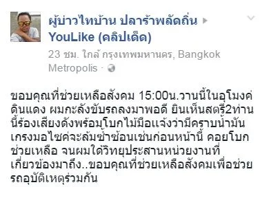 เกิดเป็นอีกหนึ่งเรื่องราวที่กำลังได้รับเสียงชื่นชมอย่างสนั่นหวั่นไหวในโลกสังคมออนไลน์อยู่ขณะนี้ ต่อภาพเหตุการณ์ที่ถูกเผยจากสมาชิกเฟซบุ๊กที่ใช้ชื่อว่า “ผู้บ่าวไทบ้าน ปลาร้าพลัดถิ่น” ซึ่งเมื่อวันที่ 18 เมษายน 2560 ที่ผ่านมา เจ้าของเฟซบุ๊กดังกล่าวได้ออกมาเผยภาพของหญิง ชายคู่หนึ่ง ขณะพร้อมใจกันยืนโบกไม้โบกมืออยู่บริเวณปากอุโมงค์ดินแดง เพื่อส่งสัญญาณไปถึงผู้ใช้รถใช้ถนนที่กำลังจะสัญจรผ่านอุโมงค์แห่งนี้ได้ระมัดระวัง ว่าตรงบริเวณนี้มีคราบน้ำมันหกอยู่ โดยหวั่นเกรงว่าจะมีอันตรายซ้ำซ้อนเกิดขึ้น