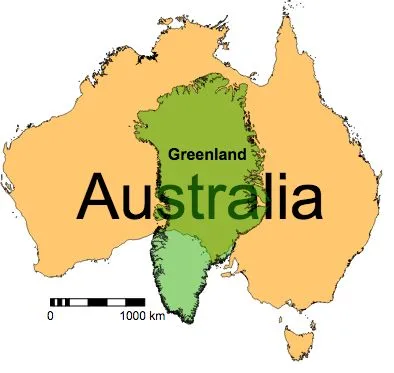 ภาพแสดงขนาดของกรีนแลนด์และออสเตรเลียในความเป็นจริง แต่ในการแสดงแผนที่แบบเมอร์เคเตอร์ กรีนแลนด์จะปรากฏขนาดที่ใหญ่เทียบเท่าออสเตรเลีย