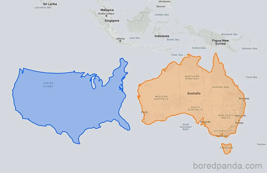 เมื่อย้ายออสเตรเลียไปไว้ที่อเมริกาเหนือ จะเห็นได้ว่ามีขนาดใหญ่มาก