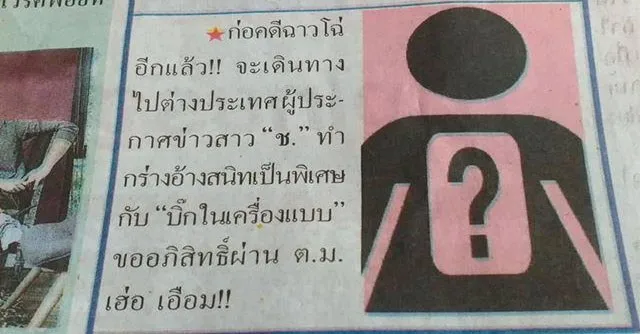 อภิสิทธิ์ชนอีกแล้ว ผู้ประกาศสาว ตัวย่อ ช. เดินทางไปต่างประเทศ ขอผ่านตม. อ้างสนิทกับบิ๊กในเครื่องแบบ เมื่อหนังสือพิมพ์ไทยรัฐ ฉบับวันที่ 22 เม.ย. คอลัมน์ คลื่นรบกวน เม้าท์มอยว่า “ก่อคดีฉาวโฉ่อีกแล้ว!! จะเดินทางไปต่างประเทศ ผู้ประกาศข่าวสาว “ช.” ทำกร่างอ้างสนิทเป็นพิเศษ กับ “บิ๊กในเครื่องแบบ” ขออภิสิทธิ์ผ่าน ต.ม. เฮ่อ เอือม!!"