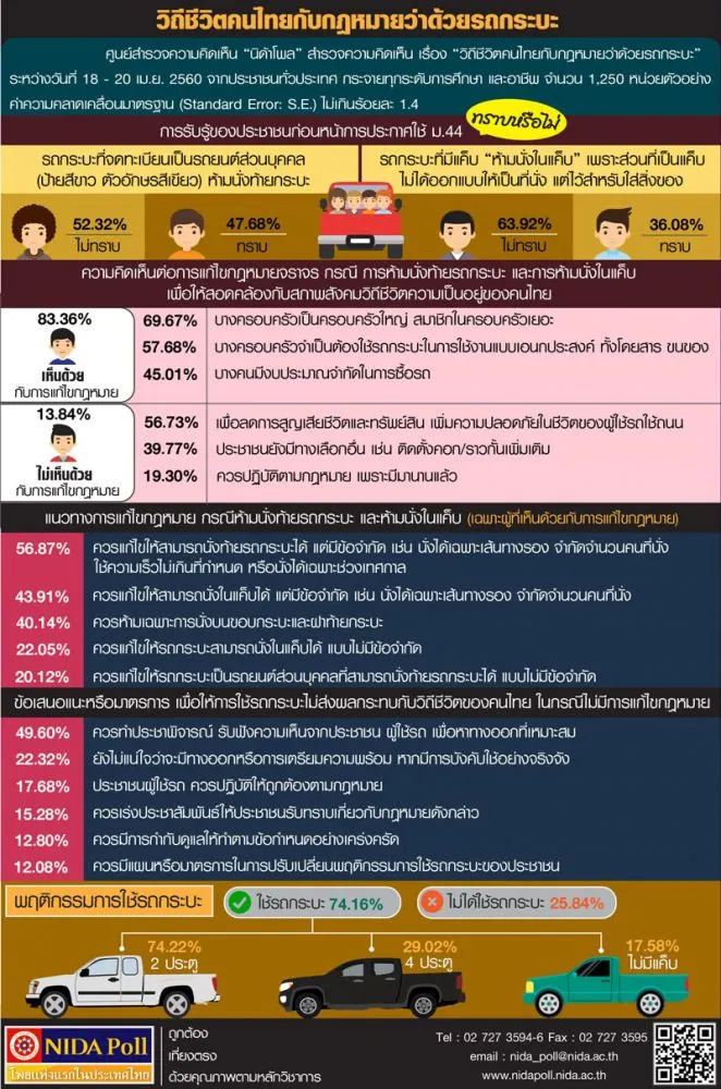 ศูนย์สำรวจความคิดเห็น “นิด้าโพล” สถาบันบัณฑิตพัฒนบริหารศาสตร์ (นิด้า) เปิดเผยผลสำรวจความคิดเห็นของประชาชน เรื่อง “วิถีชีวิตคนไทยกับกฎหมายว่าด้วยรถกระบะ” ทำการสำรวจระหว่างวันที่ 18 – 21 เมษายน 2560 จากประชาชน ที่มีอายุ 18 ปี ขึ้นไป ทั่วประเทศ เกี่ยวกับการห้ามนั่งในแค็บและการนั่งท้ายรถกระบะ