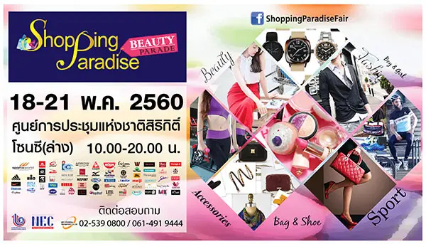 เชิญชวนเที่ยวงาน “Shopping Paradise & Beauty Parade” ครั้งที่ 16 มหกรรมแสดงสินค้าและความงามสุดฮอตแห่งปี กว่า 300 บูธ ถือเป็นงานที่มีสินค้าแบรนด์ และคุณภาพดี ราคาถูก ด้วยโปรโมชั่นพิเศษจากโรงงาน (Factory Clearance) เพราะผู้ออกร้านเป็นกลุ่มผู้ผลิตเอง และผู้นำเข้าส่งออกโดยตรง จนเป็นงานที่ได้รับคอนเซ็ปต์ว่า “ ซื้อใช้เองก็ได้ ซื้อขายต่อยิ่งคุ้ม !!! ราคาดีต่อใจ สบายกระเป๋า ” หรือเรียกว่าเป็นสวรรค์แห่งการช็อปปิ้ง ที่รวมสินค้าทุกไลฟ์สไตล์อย่างครบวงจร ไม่ว่าจะเป็นสินค้ากีฬาเพื่อการออกกำลังกาย กลุ่มแฟชั่น เครื่องแต่งกาย กระเป๋า รองเท้า ฯลฯ นอกจากนี้ยังมีกลุ่มเครื่องสำอาง ความงามครบวงจร รวมไปถึงของใช้ในบ้าน และสินค้าอุปโภคบริโภคครบทุกเพศทุกวัย รวมถึงยังมีสินค้าของผู้ประกอบการภายใต้กรมส่งเสริมอุตสาหกรรม กระทรวงอุตสาหกรรม ร่วมออกงานอีก 40 บูธ เพื่อสร้างสีสันและเพิ่มความหลากหลาย