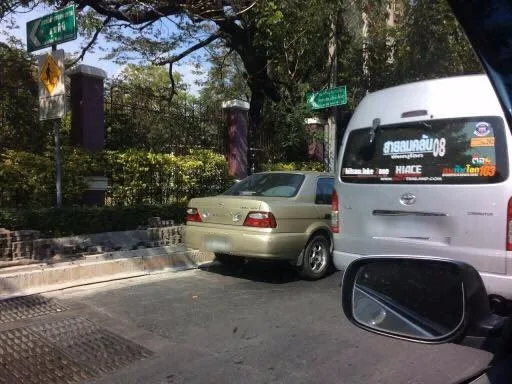 พอดูแล้วไม่น่าใช่รถเสีย เพราะถ้าเสียน่าจะขอคนช่วยเหลือ ให้เข็นไปอีกหน่อยข้างหน้าทางเลี้ยวซ้ายสามารถจอดได้โดยไม่ทำให้รถติดครับ แถมรถเสียต้องเปิดไฟกระพริบทิ้งไว้ครับ อันนี้ ไม่ทำอะไรเลย แถมพับกระจกจอดทิ้งยาวๆ