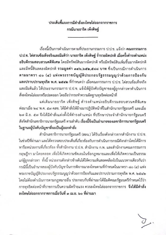 เลขาธิการนายกรัฐมนตรีชี้แจงไล่ออก ธาริต เพ็งดิษฐ์ มีผลตั้งแต่ 3 เมษายน 2560 เหตุร่ำรวยผิดปกติ 346 ล้านบาทช่วงเป็นอธิบดีดีเอสไอ เผยเป็นไปตามการไต่สวนข้อเท็จจริงของป.ป.ช.ทุจริตต่อหน้าที่เมื่อถูกไล่ออกไม่มีบำเหน็จบำนาญ