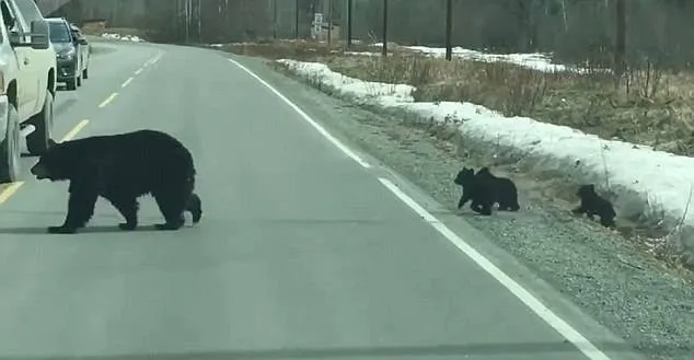 แม่หมีพาลูกๆ ข้ามถนน