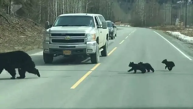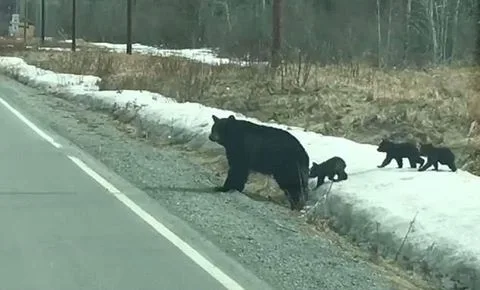 ภาพชุดนี้เป็นเหตุการณ์ที่เกิดขึ้นบนทางหลวงในอลาสก้า สหรัฐอเมริกา โดยแม่หมีดำได้พาลูกของมัน 3 ตัวข้ามถนน รถที่ผ่านไปมาได้พร้อมใจกันจอดนิ่งเพื่อให้พวกมันไปข้ามถนนอย่างปลอดภัย